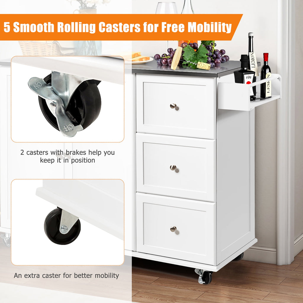 The key to keep a neat kitchen or create a convenient dining environment is bringing the kitchen cart home. It features a stainless steel countertop which is characterized by higher sturdiness and easier cleaning. And it rolls to anywhere you want thanks to smooth–rolling wheels. Instead of ordinary 4-wheel design, this unique kitchen cart is equipped with 5 wheels, ensuring higher stability and larger weight capacity. Besides, a spice storage shelf and towel rack allows quick access to the spice bottles and kitchen towel when you need them. The kitchen island will appeal to your guest and family because its elegant design. Other features include 2 adjustable shelves inside the bottom cabinet and 3 drawers.