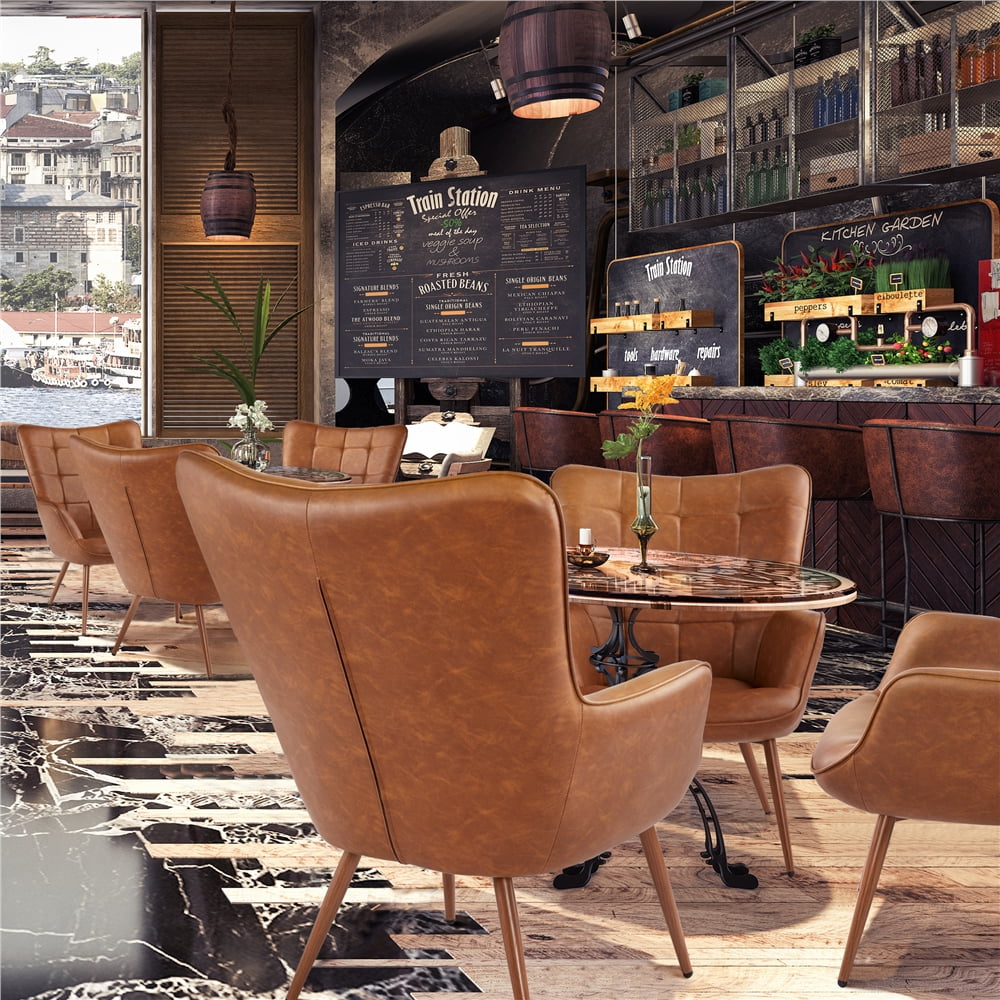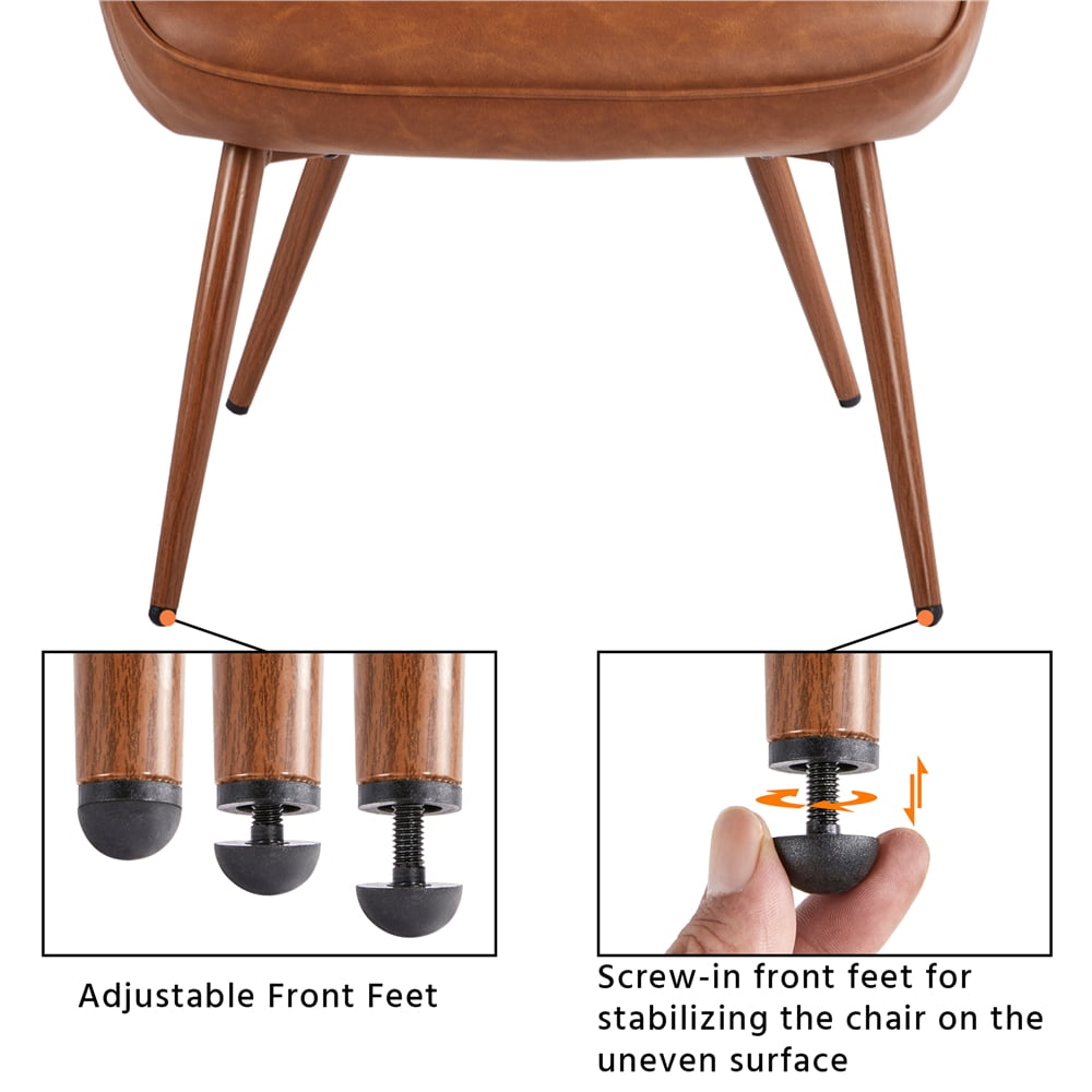 These luxurious and chic wingback recliner chairs could be a good choice. The chairs are built of good PU leather, sturdy metal frame and finished with smooth, upholstered seating, armrests and backrests. Larger sitting areas and higher backrests could greatly support your body for a better sitting experience. Slightly curved brown wing back contrasts with straight tapered legs in a printed woodgrain finish, our accent chairs not only provide you a good place to relax and rest but also add a hint of retro and chic to your space.The faux leather recliner chair with the stylish design will greatly uplift your living room, bedroom, dining room, kitchen, office, guest room. Create a corner to relax and entertain. You can read a book or watch TV on our comfy accent chair.